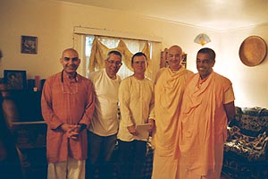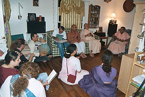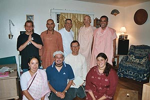 On the 30th, the last Friday of September, 2005, nine disciples of Srila Bhakti Sundar Govinda Dev-Goswami Maharaj were assembling at the Berkeley apartment of Para Devi Dasi, as she attended to last preparations, prasadam, and garlands. They arranged additional flowers which Madhavendra Dasa had just brought for the altar. Since Premamrita Dasa and Yogeswara Krishna Dasa had brought extra 'Kirttan Guides' and karatals, Anupama Devi Dasi began leading the bhajans. The room filled with anticipation, joy, and excitement!